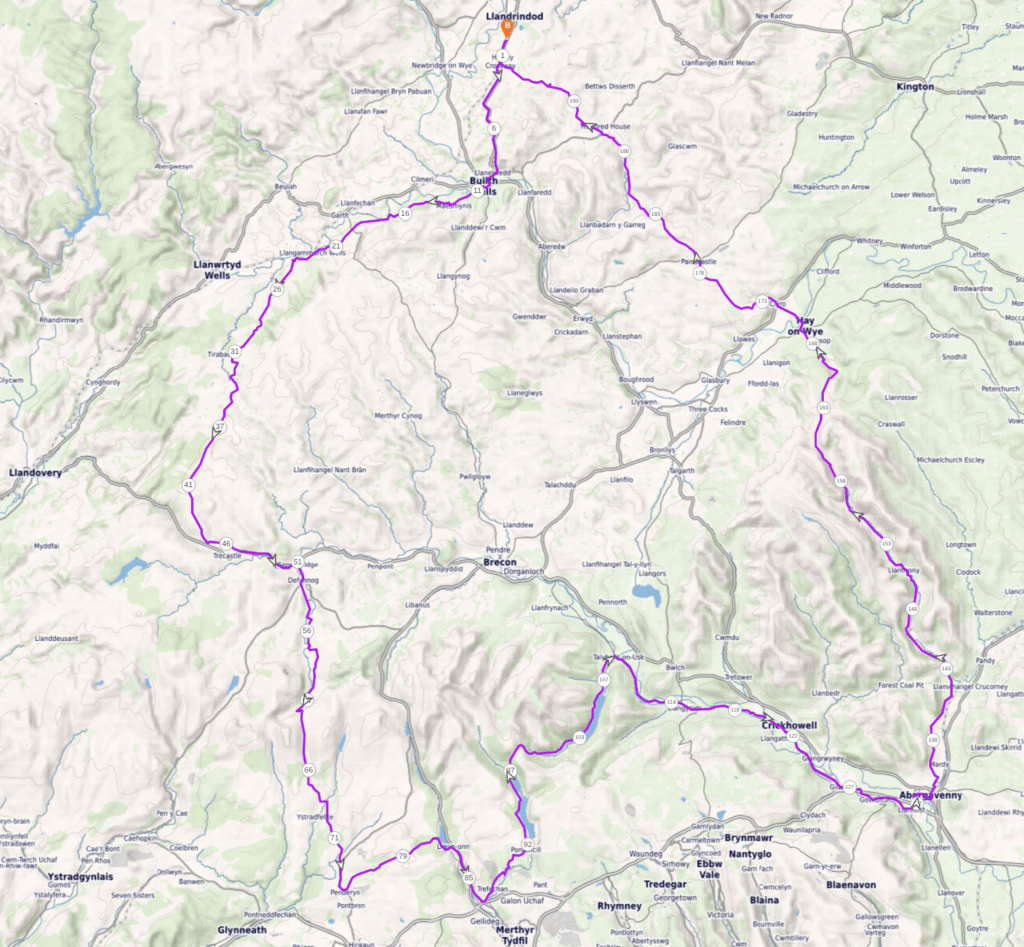 Cutting over to wards Cefn Coed, skirting the north Merthy following the lanes passing the Talybont reservoirs leads to the hallway control at Talybont-on-Usk. Proceeding down the south side of the Usk valley picking-up an info at Abergavenny, you’ll soon find yourself on the shallow climb ascending and cresting the Gospel Pass, after enjoying the vistas from the highest paved road in Wales, the next control at Hay-on-Wye will soon vom into view. Leaving Hay behind, the route now heads North, rolling across country through the hamlet of Hundred House, ultimately to drop down Howey and soon back to arriveé where you started.